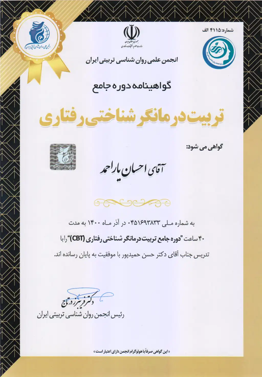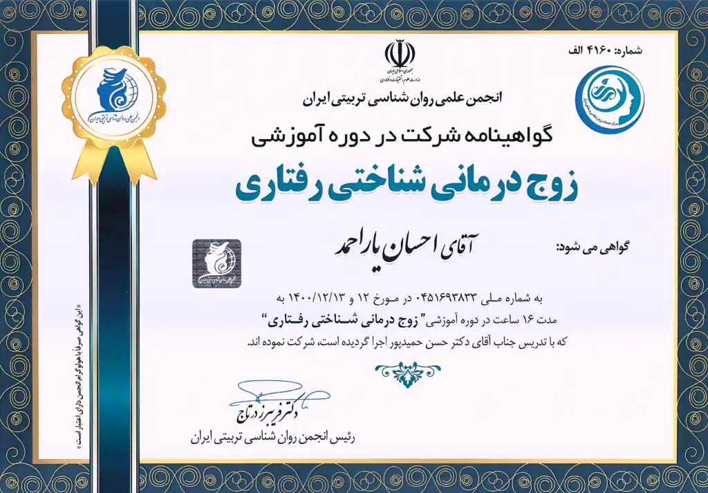 این دوره 140 ساعته CBT (رفتار درمانی شناختی) شامل آموزش شناسایی و اصلاح افکار منفی، تغییر الگوهای رفتاری ناسالم، استفاده از تکنیک‌های عملی برای مدیریت استرس و بهبود سلامت روان، و مهارت‌های کاربردی در روان‌درمانی شناختی-رفتاری بود که به ارتقای دانش و توانایی عملی من در مشاوره و درمان کمک کرد.